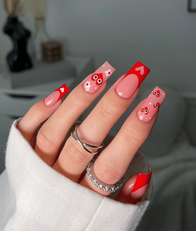 This nail design is bold, one-of-a-kind, and entertaining. Each nail has a unique orange pattern, such as black outlines, a nude base, and orange flames. It’s such a bold and eye-catching concept. You may recreate the entire effect or just the orange flames, which would look fantastic!